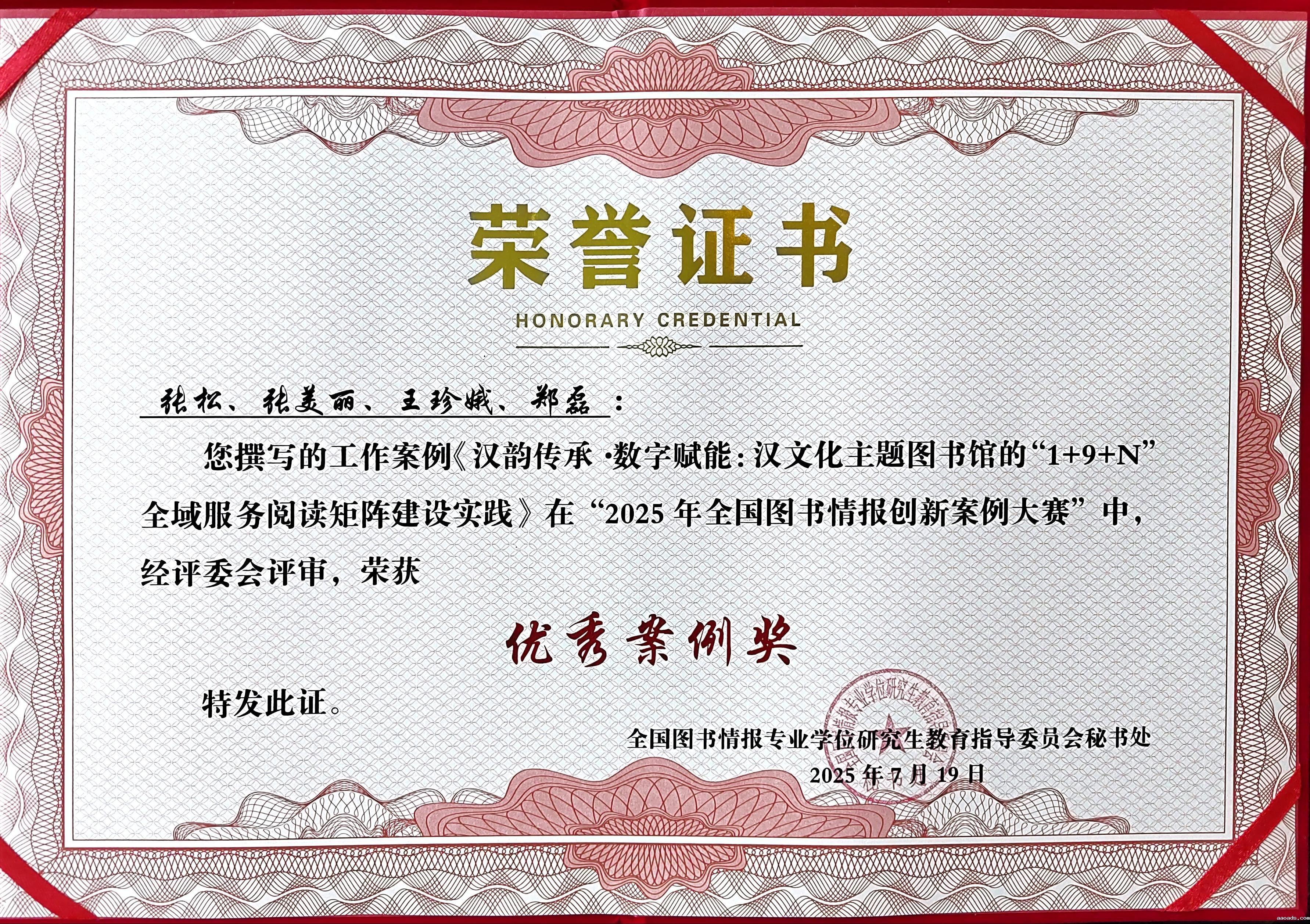 7月18日-7月20日,由全国图书情报专业学位研究生教育指导委员会主办的“2025年全国图书情报案例学术研讨会暨图书情报创新案例大赛”在合肥召开。今年图书情报创新案例大赛吸引了来自全国高校、科研机构113家的近千名师生踊跃参与,共征集案例319 份,最终遴选出“优秀案例奖” 81 项,数量与质量均创历届新高。我校管理学院张松老师和徐州市云龙区图书馆合作编写的工作案例《汉韵传承·数字赋能:汉文化主题图书馆的“1+9+N”全域服务阅读矩阵建设实践》,凭借其创新性和示范性,从众多优秀作品中脱颖而出,荣获“优秀案例奖”。这是我校获批图书情报专业硕士点后,首次在该领域全国性案例比赛中斩获殊荣,标志着管理学院专业建设与人才培养取得新成绩。