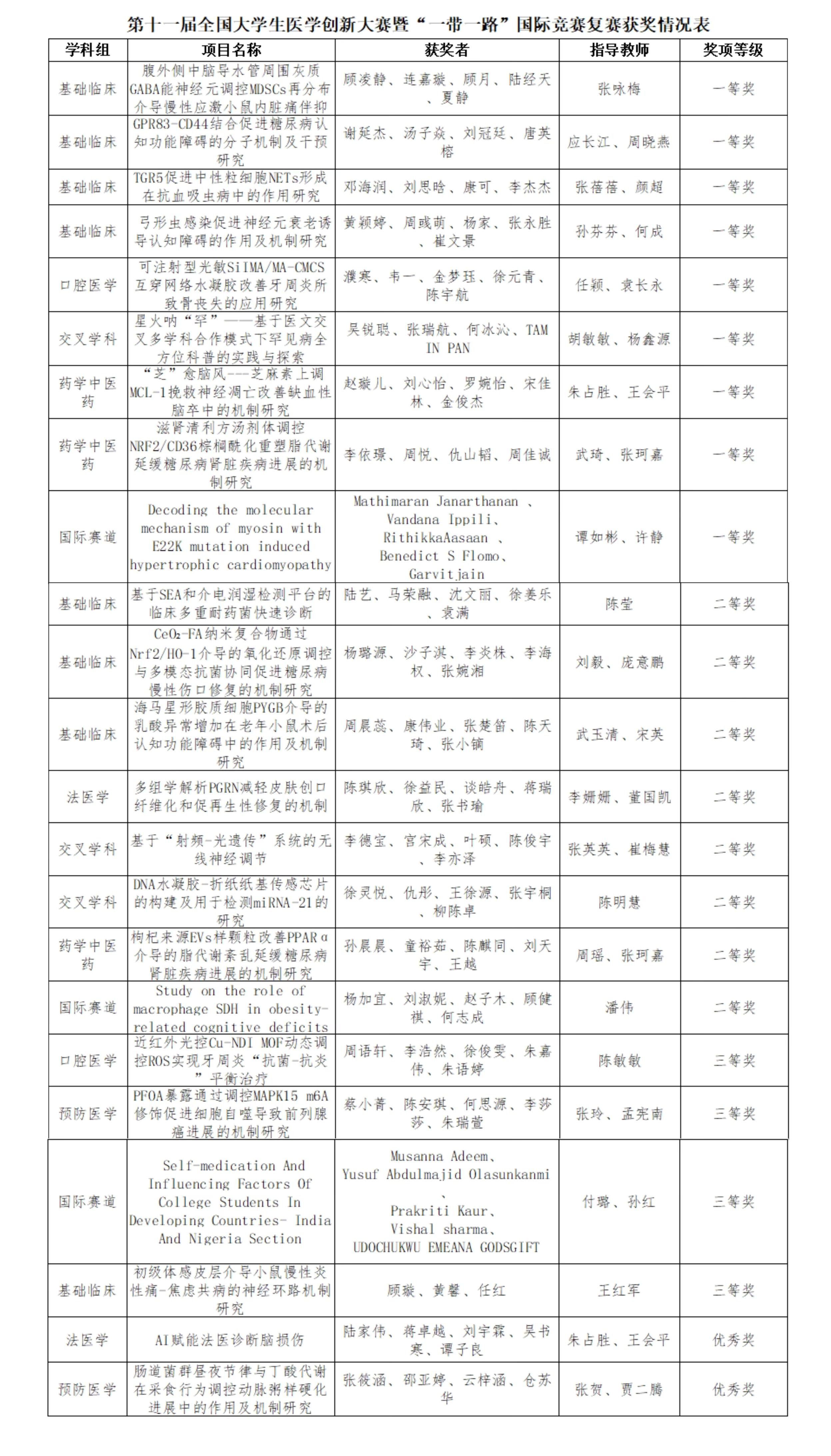 近日,由高等学校大学生医学创新竞赛委员会主办,西南医科大学、湖南中医药大学、山西医科大学分别承办的第十一届全国大学生医学创新大赛暨“一带一路”国际竞赛本科赛区法医学赛道、口腔医学赛道、预防医学赛道、药学中医药赛道、交叉学科赛道、国际竞赛以及基础临床赛道复赛顺利结束。