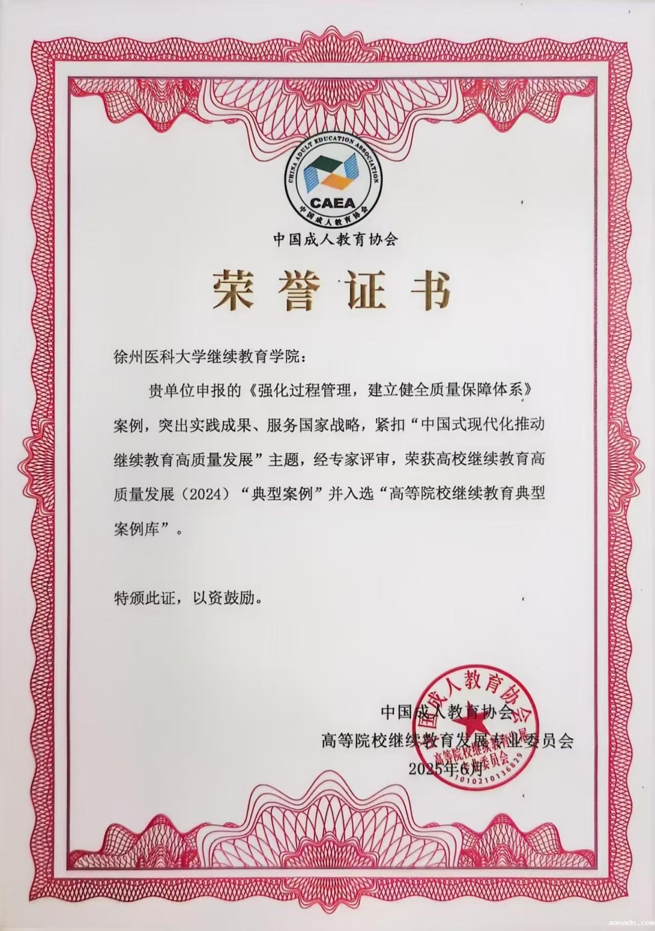 近日,以“质量引领 数智赋能 协同创新”为主题的2025(第四届)终身学习成果交流会在陕西西安举办。会议现场揭晓了“中国成人教育协会2024年度高校继续教育高质量发展典型案例”,我校申报的《强化过程管理,建立健全质量保障体系》案例经专家评审,荣获高校继续教育高质量发展(2024)“典型案例”并入选“高等院校继续教育典型案例库”。