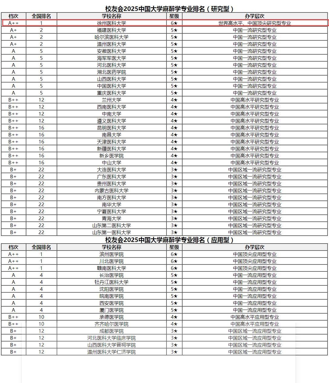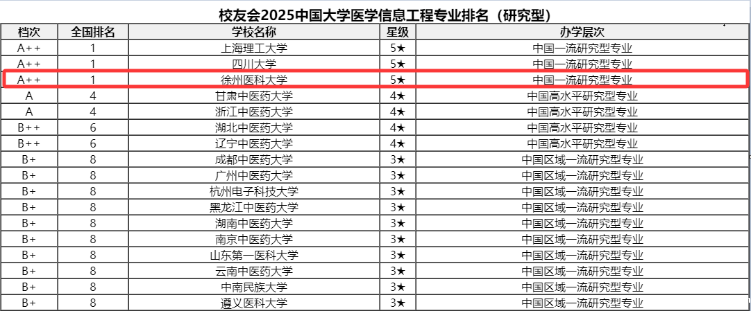 近日,全国第三方大学评价机构艾瑞深校友会网(Cuaa.net)最新发布校友会2025中国大学一流专业排名。我校麻醉学专业获评研究型专业6星级(A++)认证,医学信息工程专业获评研究型专业5星级(A++)认证,两个专业均在专业类排名中位居全国第一,其中,麻醉学专业连续三年蝉联榜首。