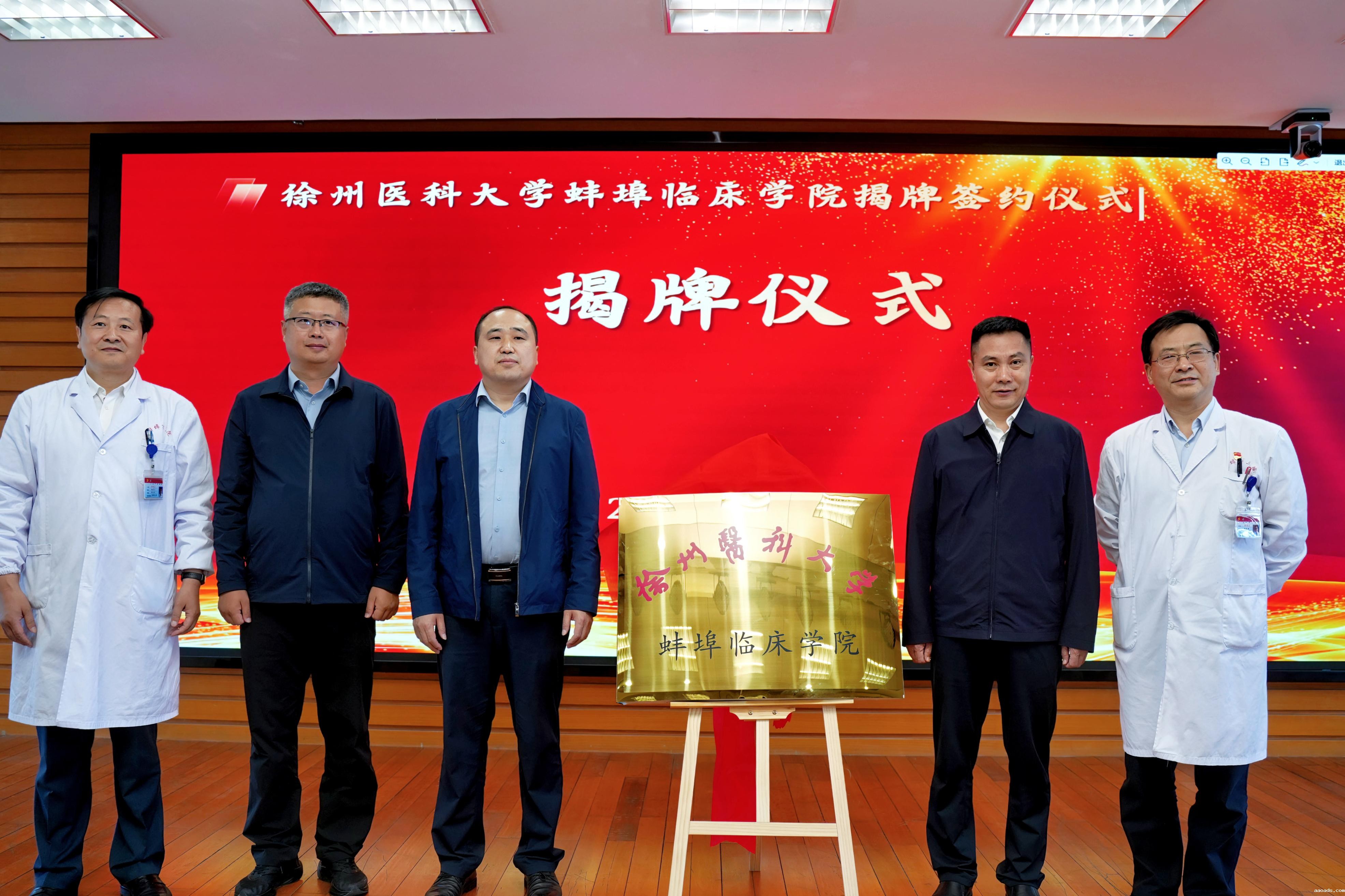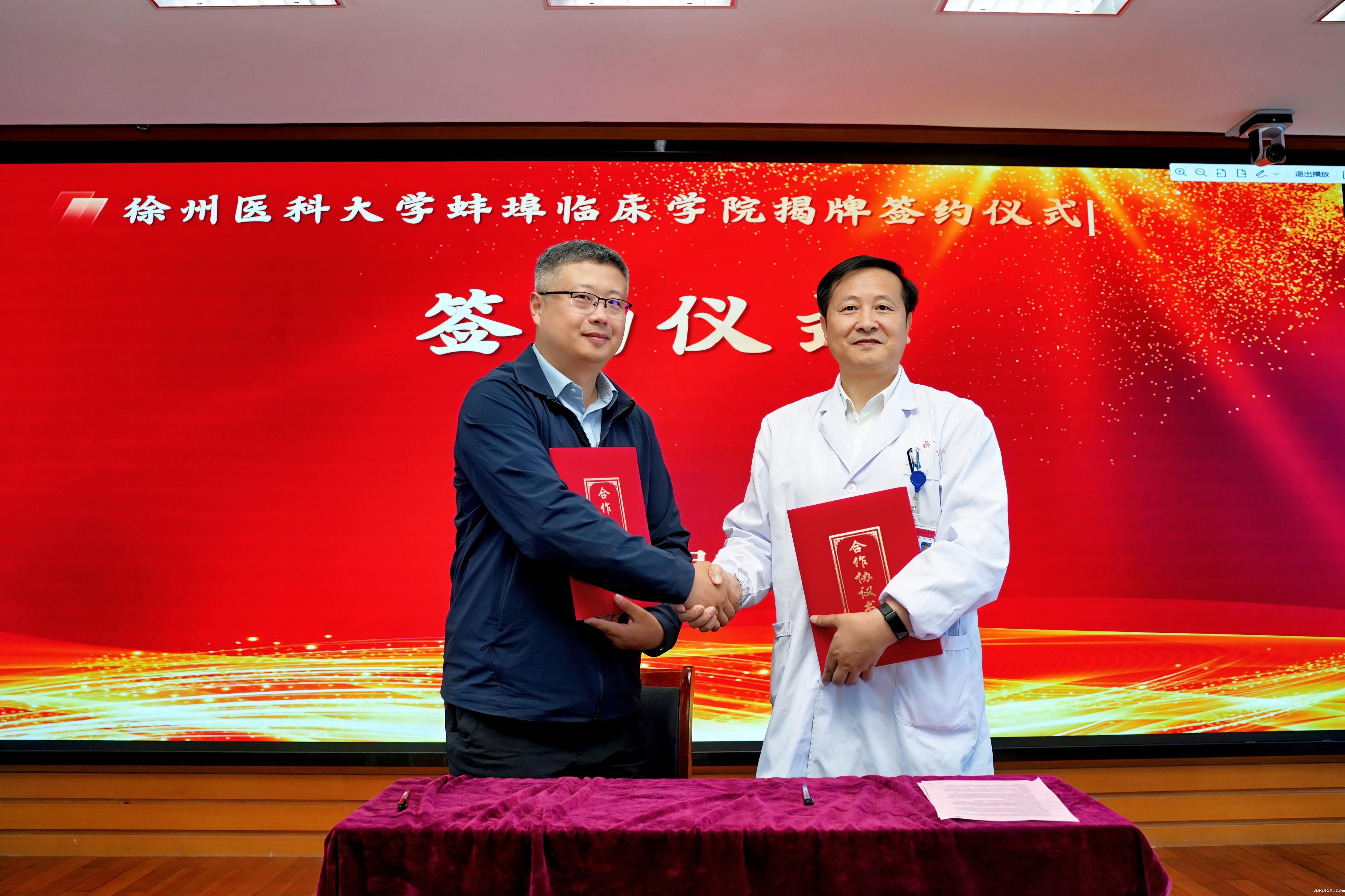 郭栋、杨勇飞共同签署合作协议,刘慎军、刘长青共同为“伟德客户端下载安装手机版蚌埠临床学院”揭牌。