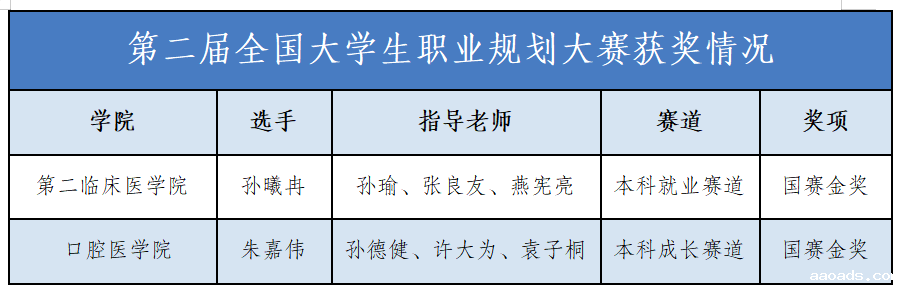 4月17日至19日,第二届全国大学生职业规划大赛总决赛在湖南长沙举行。我校第二临床医学院2021级临床医学(急救与救援医学)专业孙曦冉同学和口腔医学院2023级口腔医学专业朱嘉伟同学凭借出色表现,分别斩获就业赛道高教本科组金奖、成长赛道高教本科组金奖,获金奖数在省内高校中并列第一,在全国独立设置医学院校中位列第一!