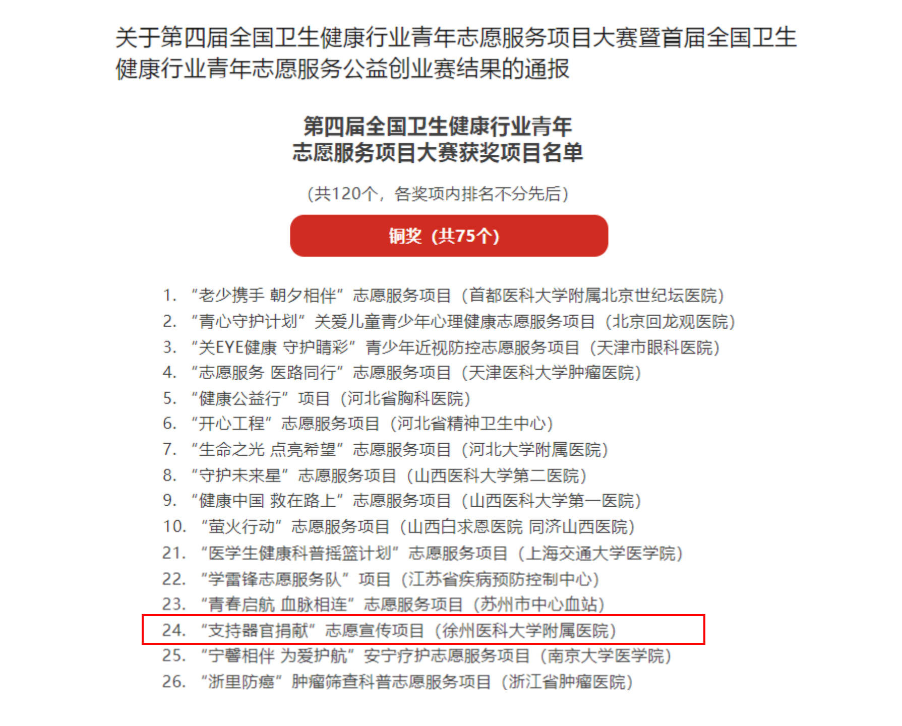 近日,国家卫生健康委文明办印发《关于第四届全国卫生健康行业青年志愿项目服务大赛暨首届全国卫生健康行业青年志愿服务公益创业赛结果的通报》,通报表扬在国家卫生健康委、中国青年志愿者协会联合举办的第四届全国卫生健康行业青年志愿服务项目大赛中获奖的项目。“徐医附院支持器官捐献志愿宣传项目”经过激烈角逐,以优异的成绩斩获铜奖。