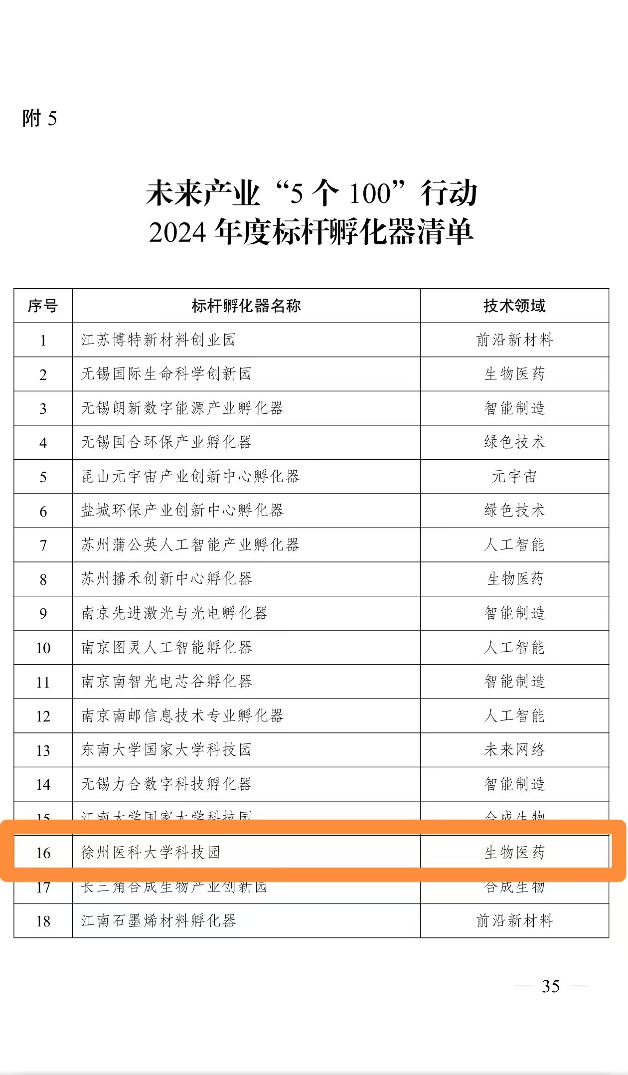 江苏省围绕“10+X”未来产业体系,大力实施科技创新引领未来产业发展“5个100”行动,统筹部署前沿技术、标准规范、应用场景、示范企业、标杆孵化器,支撑全省未来产业蓬勃发展。省标杆孵化器是以支撑加速前沿科技成果转化和未来产业培育为目标,以孵化“硬科技”企业为主攻方向,高效整合创新创业所需的资本、数据、场景等资源要素供给,具有专业示范带动强、孵化育成能力突出、有代表性和影响力等特征的高质量创新创业载体。近年来,科技园以国家大学科技园建设为引领,依托学校优势学科和一流专业建设,结合徐州市各版块资源禀赋,构建“一园多区”创新格局,围绕细胞治疗、医工结合、数智健康等产业方向,充分发挥创新资源集成、科技成果转化、科技创业孵化、双创人才培养和开放协同发展五大职能,着力构建“众创空间—孵化器—加速器—产业园”的全产业链双创孵化服务体系,不断提升科技转化服务能力及企业梯度孵育水平,赋能地方生物医药产业高质量发展。