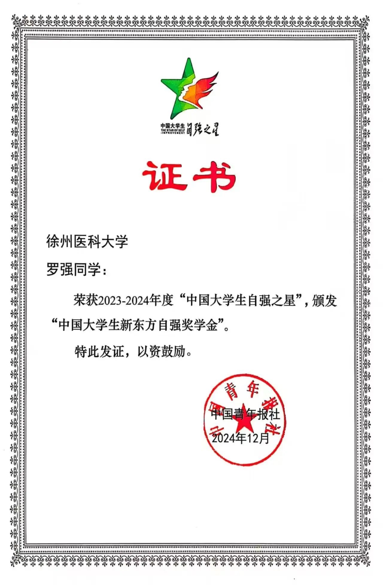 近日,由中国青年报社主办,北京航空航天大学承办,新东方教育科技集团、中国青年创业就业基金会协办的2023—2024年度“中国大学生自强之星”活动总结分享会在北京航空航天大学举行。我校生命科学学院2023级细胞生物学专业研究生罗强同学获2023—2024年度“中国大学生自强之星”荣誉称号。