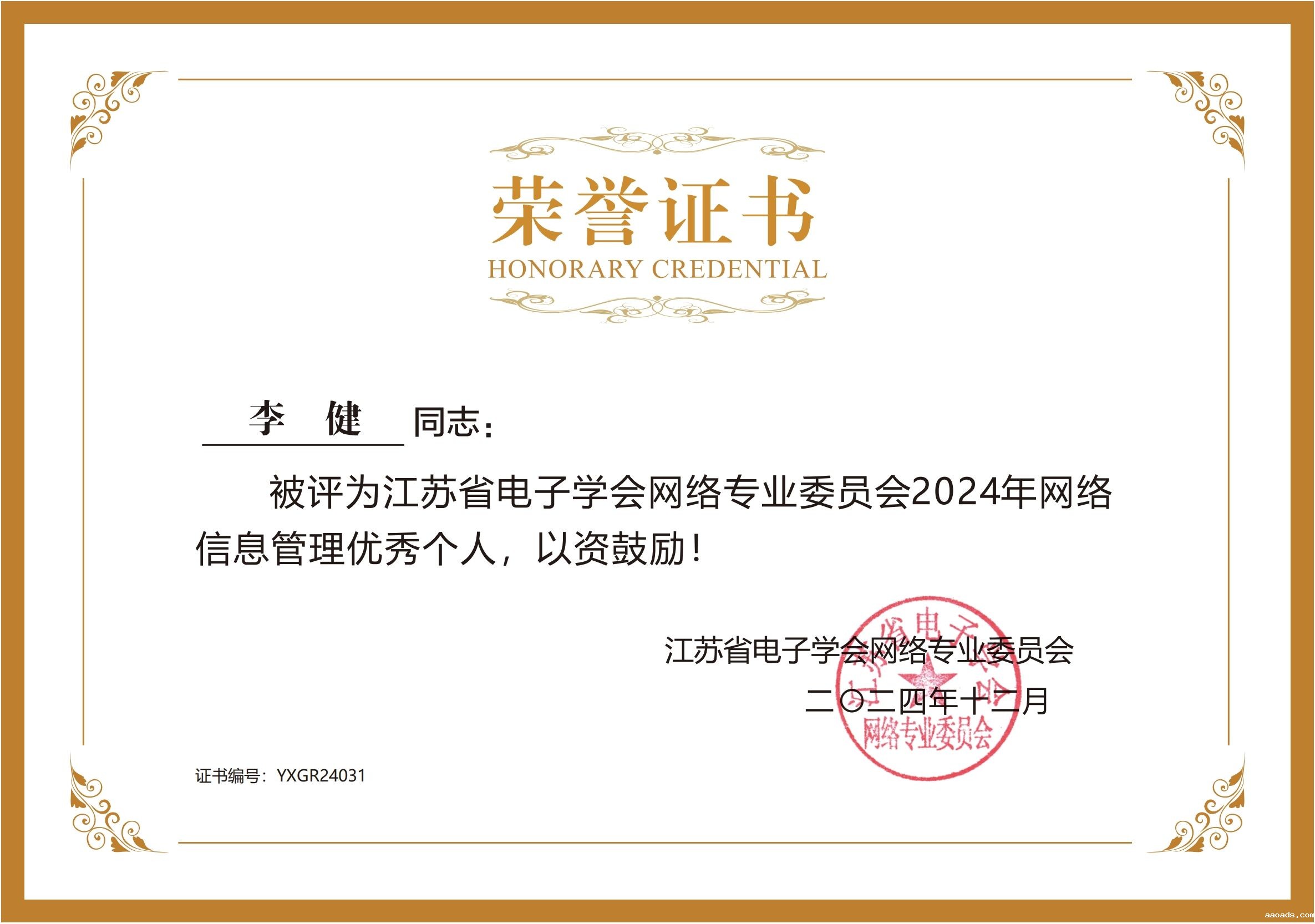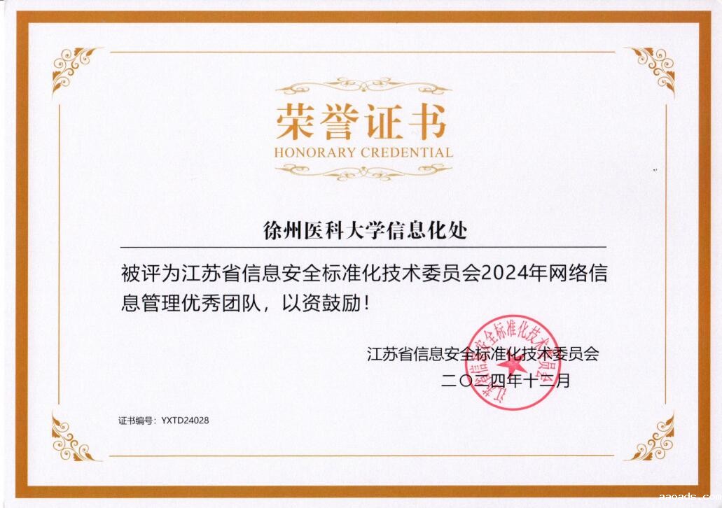 近日,我校信息化处在江苏省信息安全标准化技术委员会组织的2024年度评选中,荣膺“网络信息管理优秀团队”称号;信息化处李健同志在江苏省电子学会网络专业委员会组织的2024年度评选中,荣膺“网络信息管理优秀个人”称号。