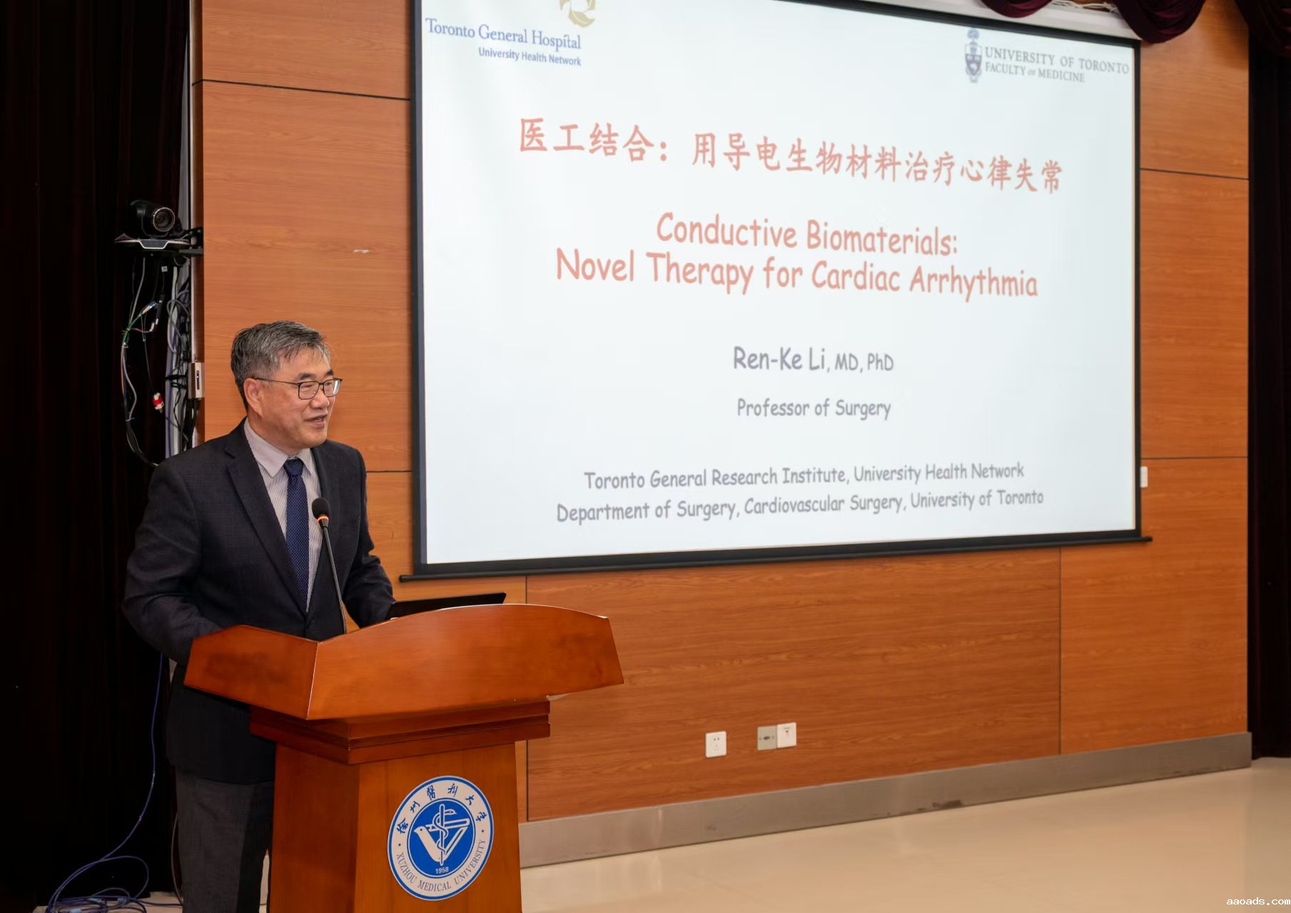 李仁科教授作了有关医工结合专题的学术报告,学校相关学院负责人、教师、在读博士、硕士研究生及高年级本科生代表参加。李仁科院士结合自己在心血管领域的科学研究经历,围绕生物材料在心血管疾病中的应用,深入浅出地介绍了心血管疾病的危害、生物材料的合成与设计,阐述了其修复心肌梗死或缺血再灌注损伤的有效性、安全性及其改善心律失常的效能和机制,分析了生物材料在心血管疾病中的转化应用现状,展望了生物材料的临床应用前景,并与现场师生交流互动。