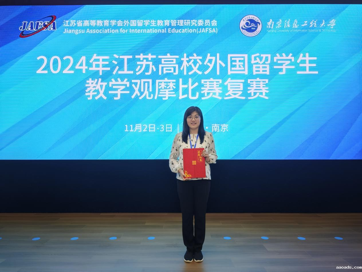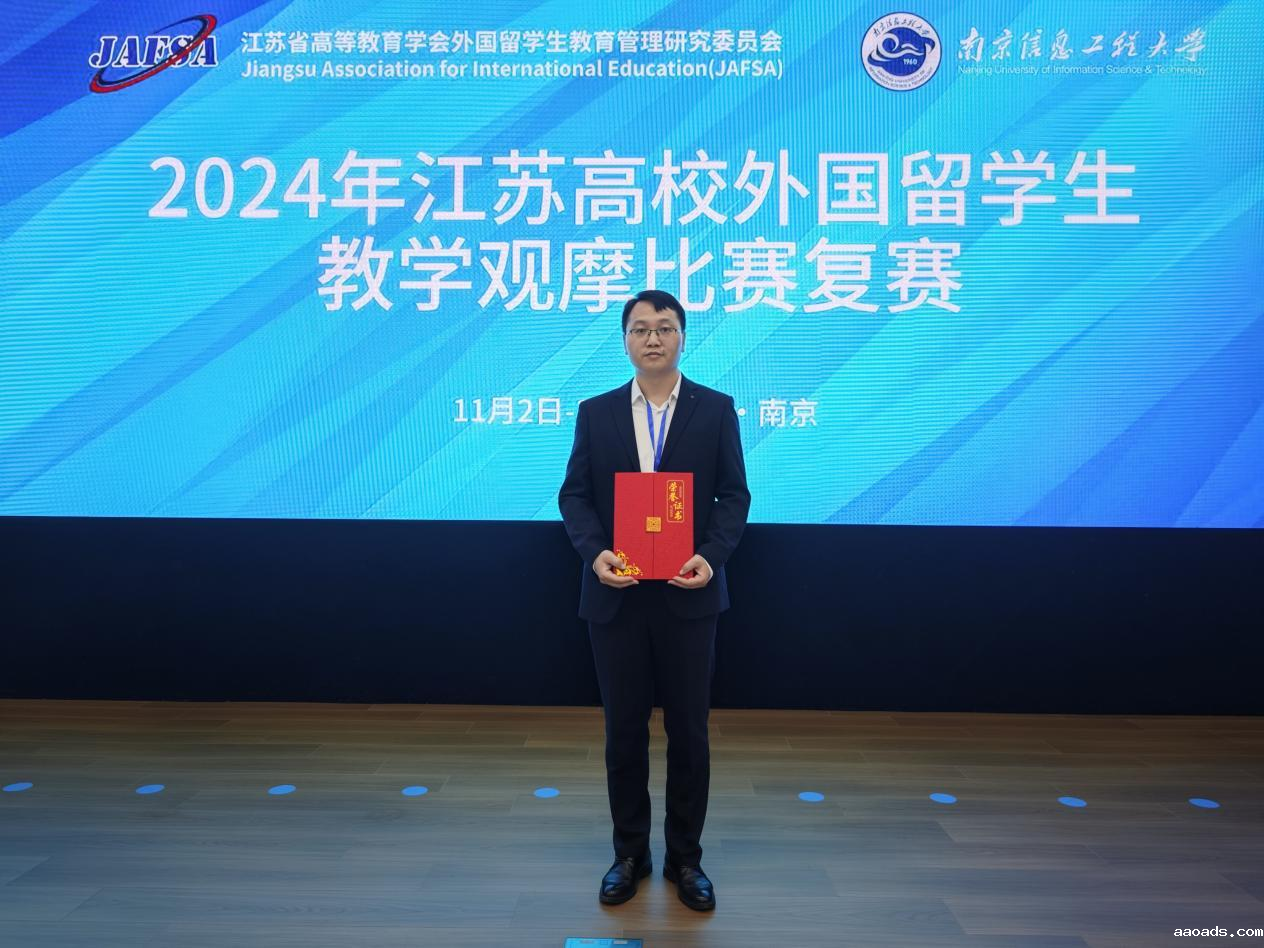 11月3日,2024年江苏高校外国留学生教学观摩比赛复赛在南京信息工程大学落下帷幕,来自全省63所高校的137门课程通过初赛评审,晋级现场教学复赛。我校国际教育学院院长张卓琦带领两名青年教师、学生评委Arshad Saeed前往南京参赛,生命科学学院于亚男老师的《医学遗传学》荣获一等奖、基础医学院宋亮老师的《人体系统解剖学》荣获三等奖。