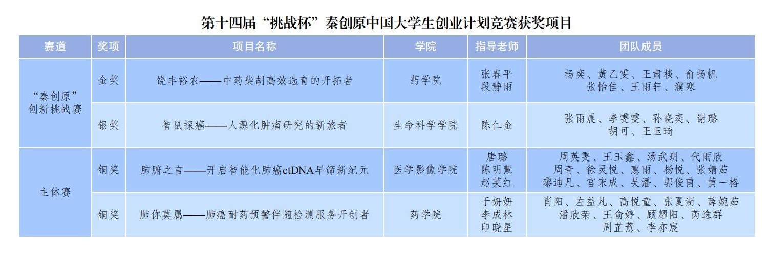 10月29日—11月2日,由共青团中央、教育部、人力资源社会保障部、中国科协、全国学联、陕西省人民政府联合主办,由西安交通大学、共青团陕西省委承办的第十四届“挑战杯”秦创原中国大学生创业计划竞赛在西安交通大学举行。我校荣获国奖4项,其中金奖1项、银奖1项、铜奖2项。