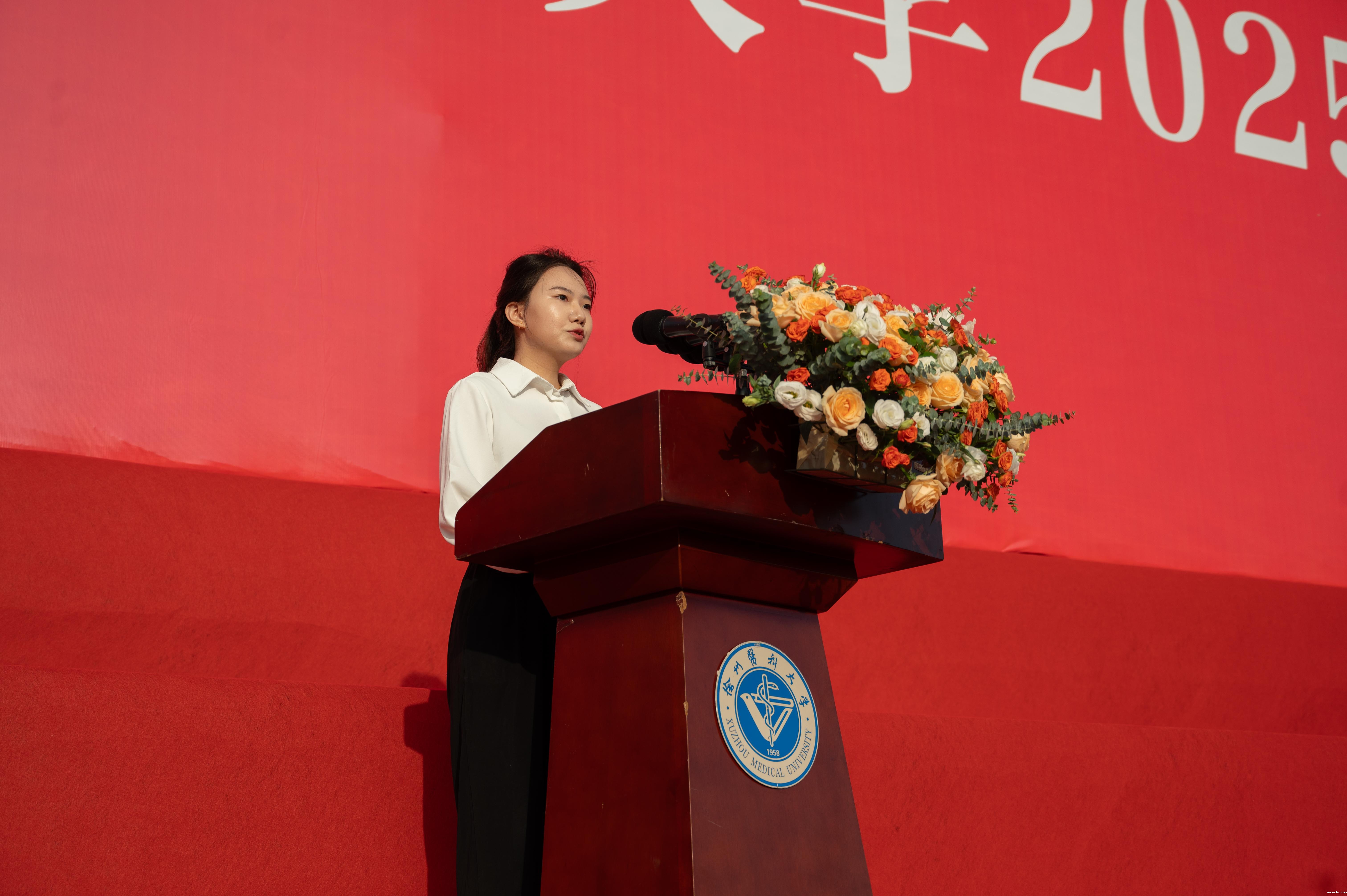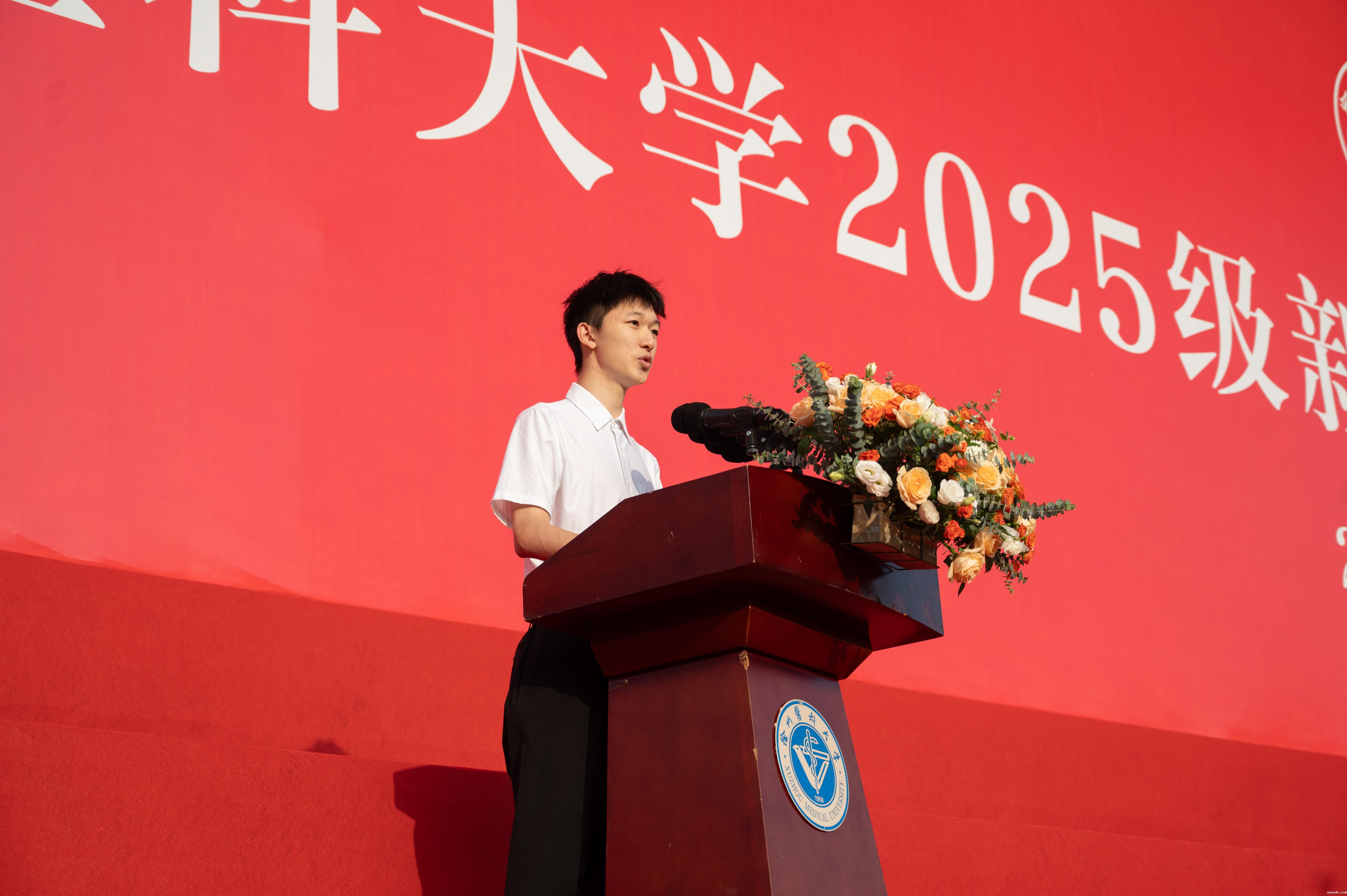 “与徐医的相遇,是爱我所爱的坚定抉择,是行我所行的奋力奔赴。”本科生新生代表、第一临床医学院临床医学专业卞振宇同学围绕“选择”“破圈”“梦想”三个关键词,与大家分享了自己对未来的思考,决心秉承“以德载医、博学创新”校训,筑牢专业根基,锤炼医德医术,努力成长为守护健康、攻克医学难题的新生力量,为健康中国建设贡献徐医学子的青春与智慧。