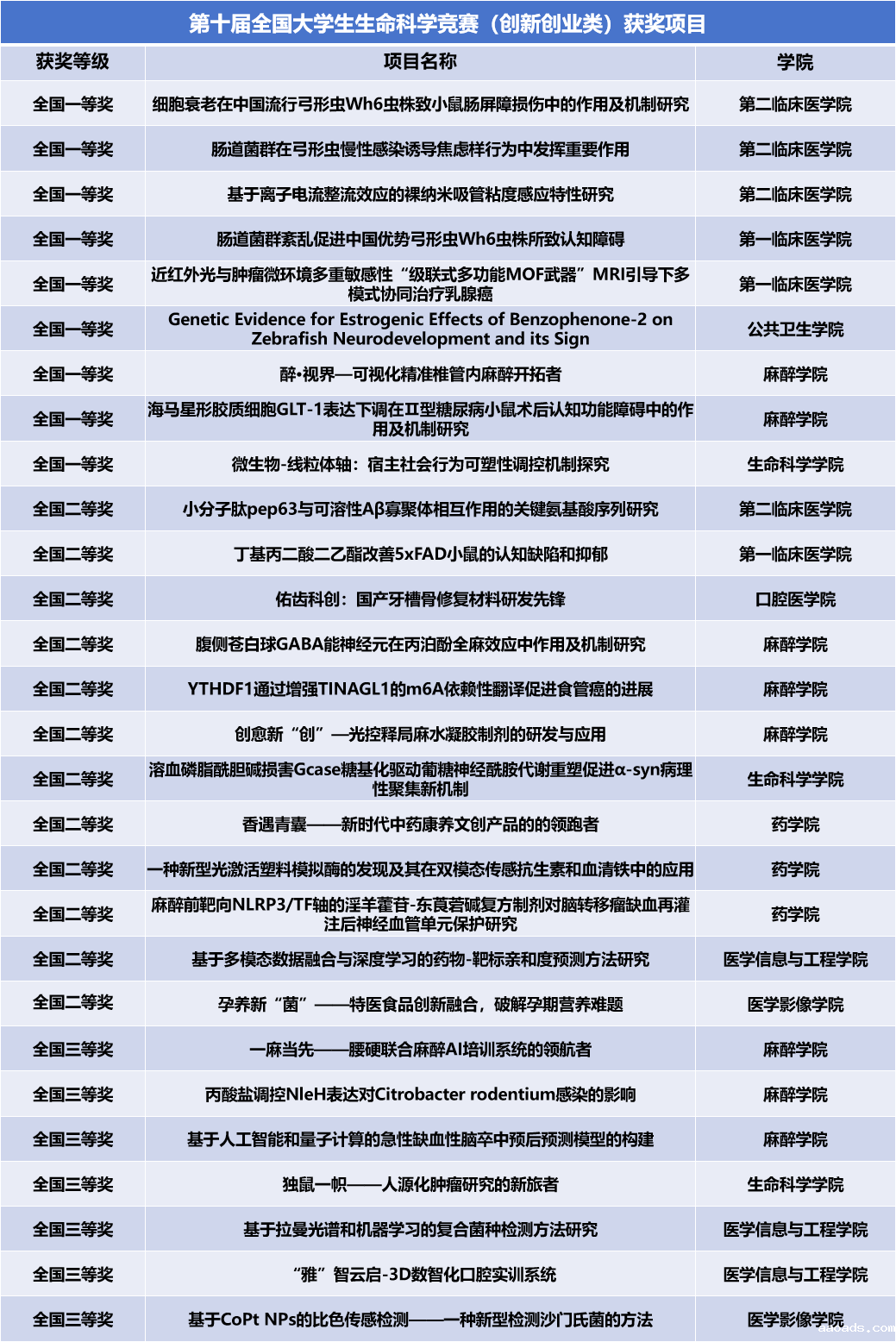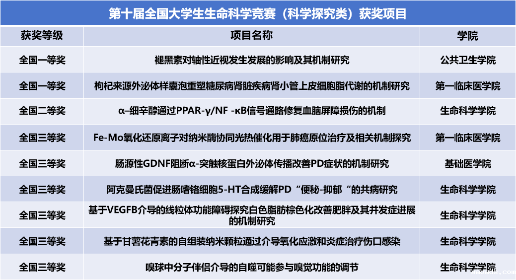 我校第一临床医学院的《枸杞来源外泌体样囊泡重塑糖尿病肾脏疾病肾小管上皮细胞脂代谢的机制研究》(指导教师:周瑶、武琦)、公共卫生学院的《褪黑素对轴性近视发生发展的影响及其机制研究》(指导教师:华慧)2个项目荣获科学探究类赛道全国一等奖;我校麻醉学院的《醉·视界—可视化精准椎管内麻醉开拓者》(指导教师:武玉清、孟晶)、第二临床医学院的《细胞衰老在中国流行弓形虫Wh6虫株致小鼠肠屏障损伤中的作用及机制研究》(指导教师:何成)等9个项目荣获创新创业类赛道全国一等奖。