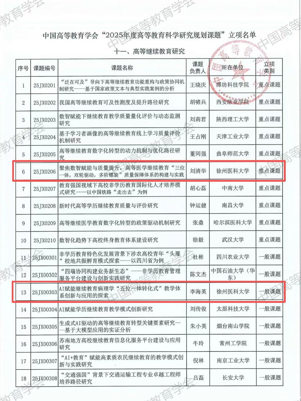中国高等教育学会公布“2025年度高等教育科学研究规划课题”立项名单,继续教育学院组织继续教育教学督导专家组组长刘清华老师申报的《聚焦数智赋能与质量提升,高等医学继续教育“三位一体,双轮驱动,多阶螺旋”质量保障体系的构建与实践》获批重点课题立项,病理学教研室李海英老师申报的《AI赋能继续教育病理学“五位一体转化式”教学体系创新与应用的探索》获批一般课题立项。两项课题均聚焦数智技术与医学继续教育的深度融合,旨在创新医学人才培养模式,回应新时代医学继续教育高质量发展的迫切需求。