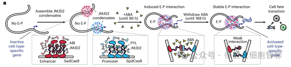 此外,团队基于上述机制构建了一套可人工调控E-P互作的技术系统:通过在特定基因组位点靶向募集JMJD2凝聚体,能够实现细胞类型特异性E-P互作的人工构建。利用该系统,研究人员成功推动细胞重编程为多能干细胞或两细胞样细胞。
