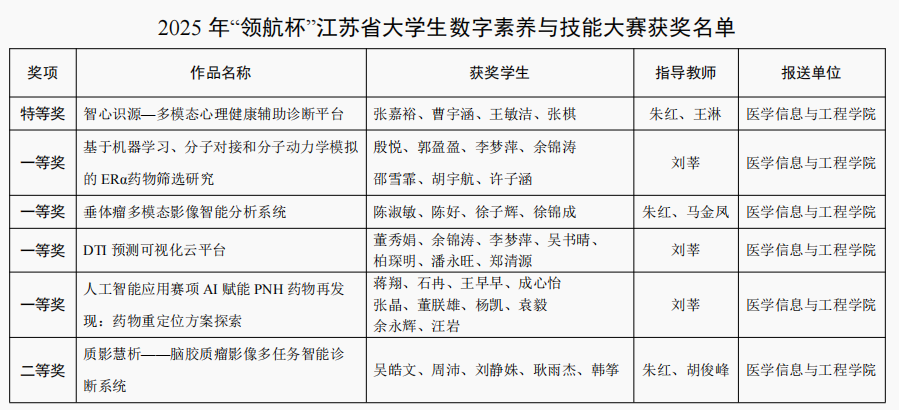 近日,由江苏省委网信办、省教育厅联合主办的2025年“领航杯”江苏省大学生数字素养与技能大赛结果揭晓。经过线上初赛、现场决赛答辩和评审专家提问等环节,我校医学信息与工程学院多项作品在人工智能应用赛道脱颖而出,获得了省赛特等奖1项,一等奖4项,二等奖1项,实现了新的突破。
