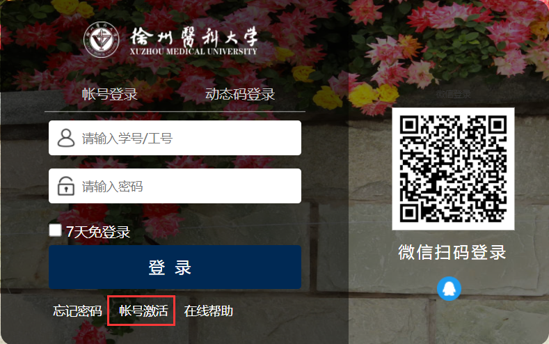 激活!激活!激活!https://ehall.xzhmu.edu.cn 登录按钮下方的帐号激活按钮进行激活!数字徐医是我校IT服务的总平台,所有学校统筹建设的IT服务项目均可以使用数字徐医账号密码,一定要激活!